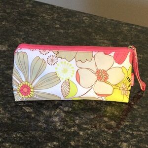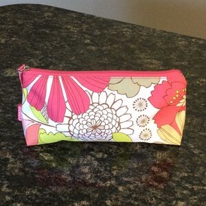 Made of 100% polyester. Features set of two floral cosmetic bags with pink, green, and tan accents against white background. Have zippered closures. Ideal for organizing essentials. Never used, and new without tags (NWOT)!
