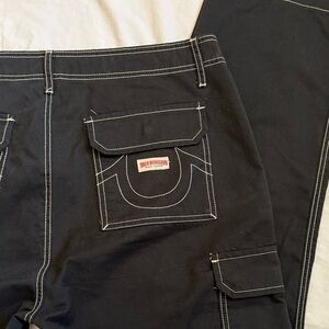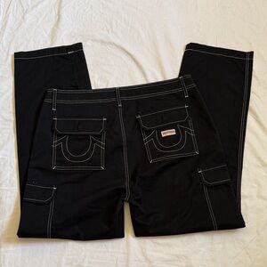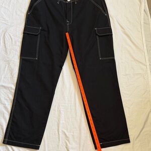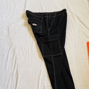 Stylish black cargo pants. Features distinct white stitching and multiple pockets. Vintage Y2K streetwear baggy
