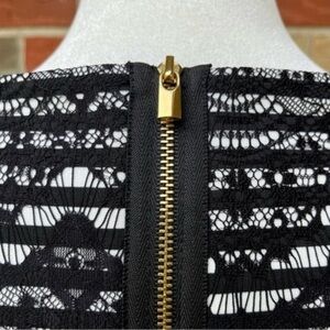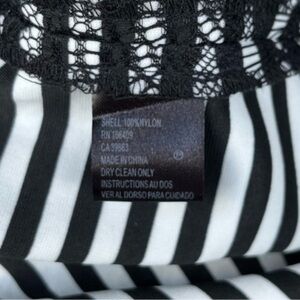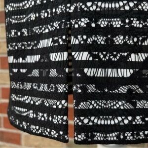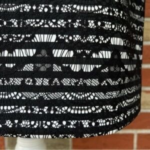 Who says neutrals need to be boring?! Pair with a bright scarf or a fun belt to add a pop of color. A white and black striped background is covered with an allover black lace overlay.
