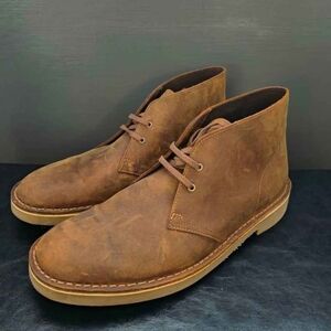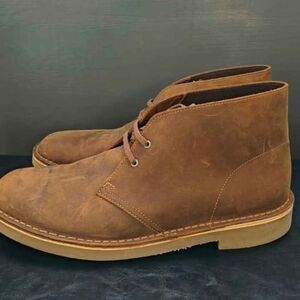 Stylish tan leather chukka boots by Clarks. Ideal for versatile wear. Comfortable and durable design.