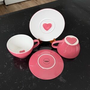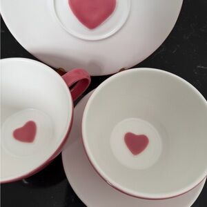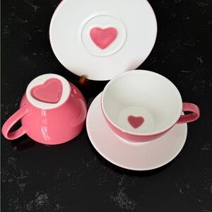 The cups have a heart-shaped indentation in the base that fits perfectly over an embossed pink heart on the center of the saucer.