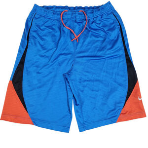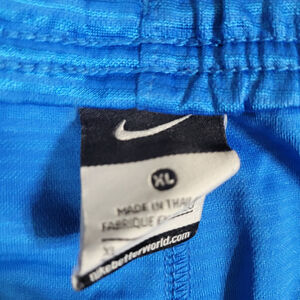 Nike Men's Basketball Shorts in size XL with a waist of 36 inches and inseam of 10 inches. These blue shorts feature a drawstring closure, mesh fabric, and an embroidered Nike logo. They are lined, have an elastic waist, pockets, and offer comfort and breathability. Suitable for athletic activities like basketball, they are machine washable and made of 100% polyester material.