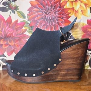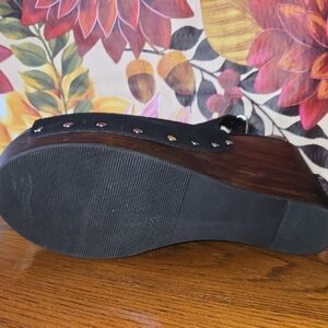 Elegant black suede upper. Rich brown wooden wedge. Silver stud accents. Beautiful stylish sandals for summer. minor scuff marks or wear (see photos) great used condition Size tag missing and not printed on sandals (see photos for measurements) they fit me and I'm size 10- 10.5
