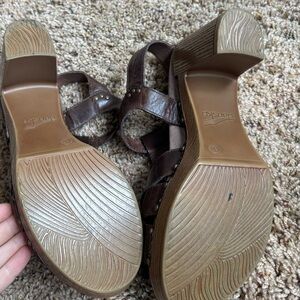 Chic brown leather platform sandals by Dansko. Features leather straps and sturdy heel easy to walk in. Size 40 minimal wear