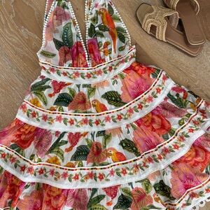 Charming mini dress by FARM Rio. Features a vibrant floral pattern. Ideal for sunny days.