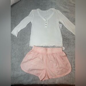 Soft cream top with button detail. Light pink shorts for a cozy fit.
