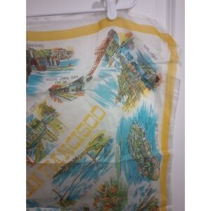 Bright retro San Francisco souvenir scarf featuring iconic landmarks including the Golden Gate Bridge, Alcatraz Island, Coit Tower, Lombard Street, Chinatown, cable car, and more. Classic mid-century travel graphics in cheerful yellow, blue, and orange tones make this a fun collectible or wearable vintage accessory.