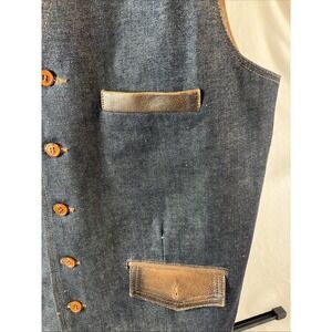 * Made with denim fabric and leather accents, this vest features a solid blue color with a button closure and a regular fit.