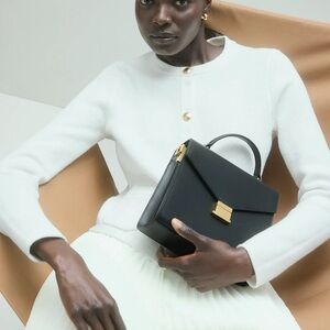 Gorgeous black top handle bag from Quince. I carried this to one evening event, so for just a few hours one time. I have too many black evening bags, so I'm letting this one go as it will not live an exciting life with me unfortunately. Very pretty, classy and elegant bag. It's also very versatile with the top handle and crossbody strap.