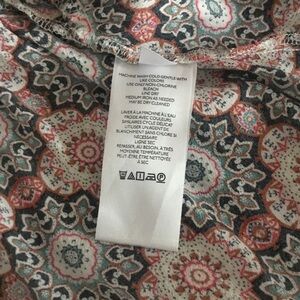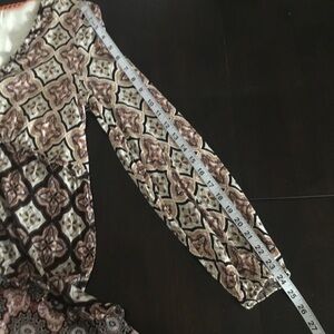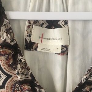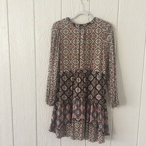 This casual sundress from Anthropologie showcases a charming v-neckline and bishop sleeves, crafted in a delightful brown and cream palette. The dress features a notched collar and a flowy silhouette, perfect for a relaxed day out. Boho, long sleeve, tiered, pullover style, v neck, NWOT size S… Please check pictures for measurements and more details. CLST