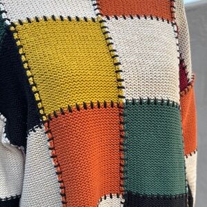 Stay cozy and stylish with this vibrant patchwork knit sweater. Featuring a mix of colors, it's perfect for adding a pop of color to your wardrobe.