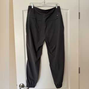 Comfortable black joggers. Perfect for casual wear or hiking. Features elastic cuffs at ankles, back is elastic front is flat, see photos. Features pockets on waist, two pockets on rear, one rear pocket has a zipper closure. Waist band is stretchy, but no pull string or fastener.