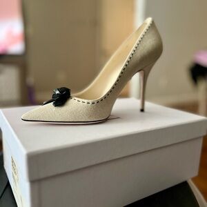 Elegant Dior pointed-toe pumps in neutral ecru with black leather camellia detail and CD hardware. Features a 4-inch stiletto heel. Made in Italy.