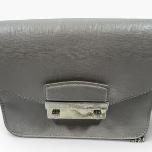 Chic Furla crossbody in taupe leather. Features a stylish silver chain strap. Ideal for any occasion.