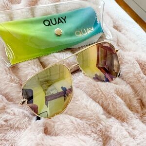 Chic aviator sunglasses by Quay Australia. Features gold frames and gold mirrored lenses. Comes with case and cleaning cloth. These are in like new condition. I also believe they’re polarized.