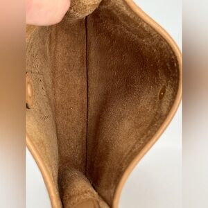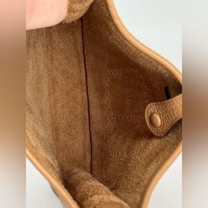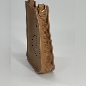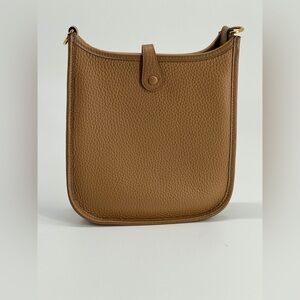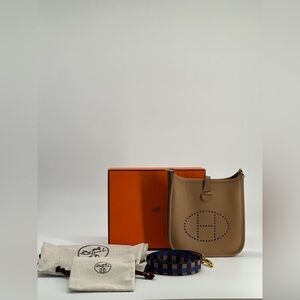 The Hermes Taurillon Clemence Evelyne TPM Shoulder Crossbody Bag is a luxurious mini handbag designed for women. Made from leather with a suede leather lining, this solid bag features a unique multicolor crossbody strap accent and gold hardware accents. The exterior is in a biscuit color with a brown lining, giving it a sophisticated and designer look. With its crossbody style and HERMÈS Evelyne product line, this bag from France is a fashionable and practical accessory for any outfit.