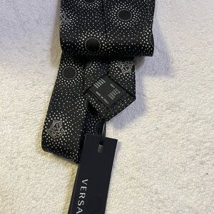 Sophisticated Versace tie with black and white dot pattern. Ideal for formal events. Adds elegance to any outfit.