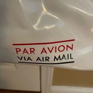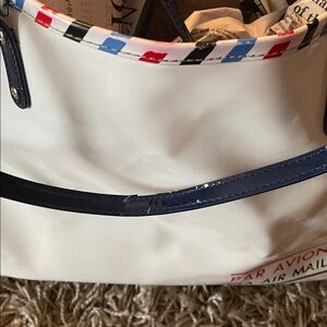 Kate Spade Par Avion White Tote with Striped Trim. Chic white tote with vibrant striped edges. Features sturdy black handles. Ideal for daily use.