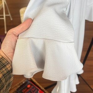 Chic white dress with black trim. Features long sleeves and ruffle accents.