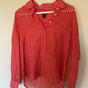 Chic red button down with diamond pattern. Ideal for casual or office wear. Super nice, very lightweight sheer blouse. Loved this blouse but just too small for me now.