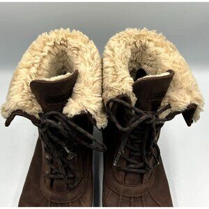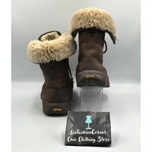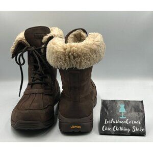 These UGG boots combine rugged durability with luxurious comfort. Crafted with rich brown leather and lined with soft sheepskin, they ensure warmth and style for cold weather. The Vibram sole enhances grip and durability, while the lace-up design provides a secure fit. Perfect for winter outings and outdoor adventures.
