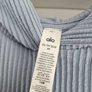 Stay cozy and stylish with the ALO Yoga Women's Blue Ribbed Sweater. Perfect for any casual outing.
