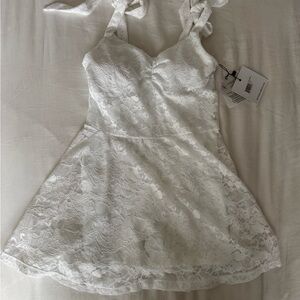 Chic mini dress with delicate lace. Features bow straps. Ideal for summer outings.