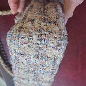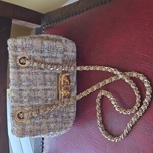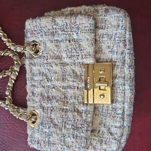 This Aldo handbag has a beautiful fabric design with beige background and blue and pink accented lurex threads. The chain can be worn on your arm or adjusted to work on the shoulder or as a crossbody. Inside is beige vinyl flap with a light mauve fabric. There is a zip pocket on one side and a pen holder and small slip pocket on the other side. Would be a great spring and summer accent handbag. In excellent used condition.