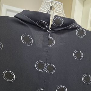 Classic and timeless Hobbs black dotted dress featuring an elegant shift silhouette with soft draped neckline and subtle ruffle cuff sleeves. The black base with delicate dotted print makes this piece perfect for office wear, business meetings, dinner dates, or polished everyday style. Flattering relaxed fit with refined tailoring that gives effortless sophistication. Easy to dress up with heels or style casually with flats or boots.