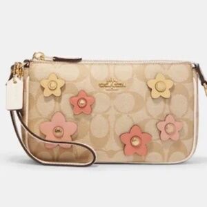 Signature coated canvas and smooth leather Floral Apliques give the front a 3D look.