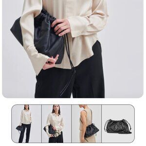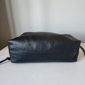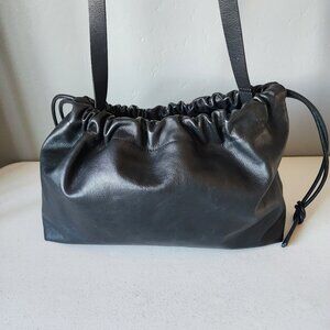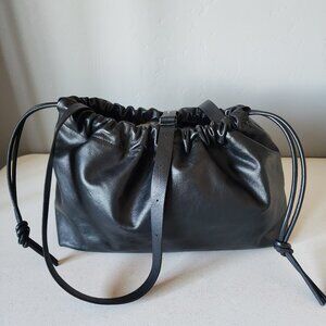 "LIKE NEW" Beautiful Smooth Black Leather Drawstring Slouchy Bag By Second Female. Use as a Crossbody or Clutch, Detachable Long Shoulder/Crossbody Strap, Drawstring Closure with Side Ties,Textile Lining/ interior with 1 Large Zip Pocket & Leather Branding Patch, Bag Measures approx. 9" T X 14" W X 5" D, Like New, No Wearing/Corners/Stains, Used Once, Tag Included:) Rt.425.00 approx. * Such a Perfect Style Bag/Use 2 Ways, Stock Photos are This Bag Shown for Many Looks & Size.