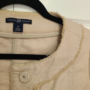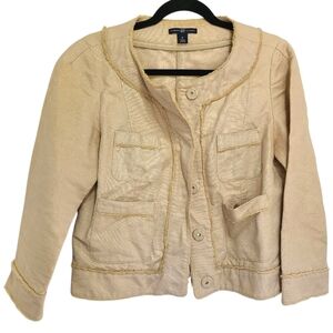 chic gold metallic beige unlined lady jacket. 3/4 sleeves, snap closure