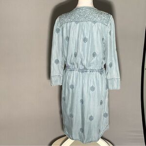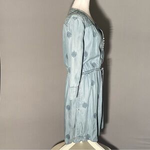 Soft washed blue Holding Horses dress featuring delicate allover embroidery and an ornate embroidered yoke front and back. Lightweight woven cotton with an easy, breathable drape—ideal for warm-weather travel, coastal stays, and relaxed resort dressing.