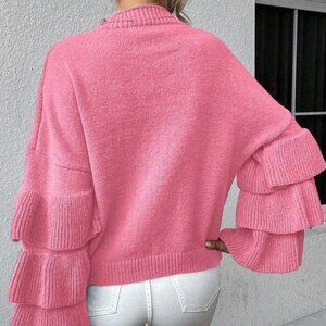 Pink Casual Women's Round Neck Patchwork Ruffle Flare Sleeve Sweater