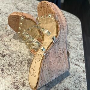 Chic clear straps with stud accents. Comfortable cork wedge. Ideal for versatile styling.