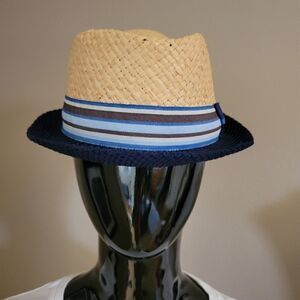 This hat has am adjustable inner band that allows it to fit multiple sizes Small to Large. The crown is a natural raffia and the brim is navy blue. The hatband is striped polyester ribbon. Designed by Grace Hat Co. in Japan and made in China.