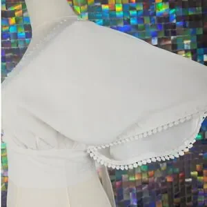 White Wrap Top Cropped Blouse Pom Trim Short Sleeve V Neck Elegant