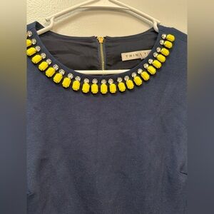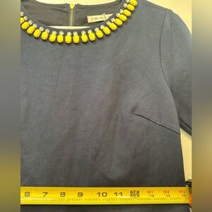 This chic blue sheath dress by Trina Turk features a striking yellow embellished crew neckline, perfect for casual work settings. The 3/4 sleeves and mini length add a touch of elegance to its versatile design.