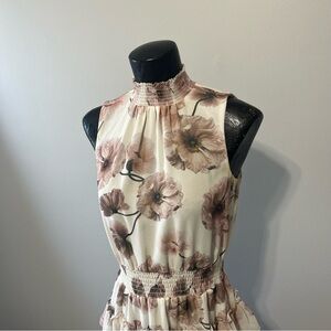 Chic floral mini dress with halter neckline. Features layered ruffles for a playful look. Perfect for day or night outings.