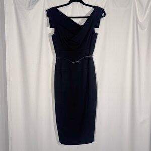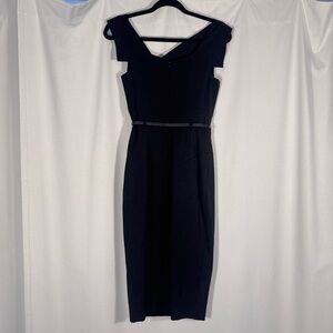 Black Halo Jackie Sheath Dress in black. Size 0. Features an asymmetric V-neckline with soft draped bodice detailing and contoured cap sleeves for a flattering, tailored fit. Designed with a banded waist and detachable buckle belt to define the silhouette. Sheath shape with back vent, concealed zip closure, fully lined. Stretchy feel. Made in the USA. Excellent condition. No flaws.