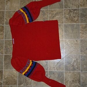 Vintage red sweater featuring vibrant striped bishop sleeves. Perfect for adding a pop of color to your wardrobe.