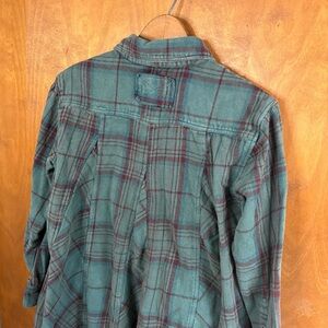 Gorgeous We The Free People green blue plaid oversized pleated babydoll button down shirt shacket in a size small. It features a button up frotn closure, a long sleeve with buttons at the cuffs, a flowy loose relaxed baggy slouchy fit, a 100% cotton fabric, & a front pocket. As seen in the photos, there's allover pilling & some fading.
