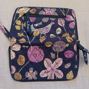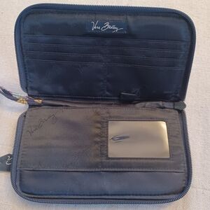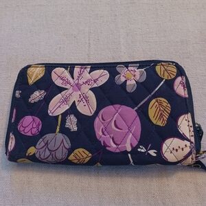 Bera Bradley navy wallet with floral and bird design. Features a zip pocket and vibrant colors.