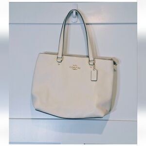 Coach white pebbled leather bay tote bag in gold hardware with hang tag, zip top, rear zipped compartment, 2 inner drop pockets & large pocket on other side with Coach patch # F 48637 from factory outlet