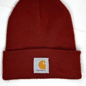 Authentic Carhartt acrylic knit cuffed beanie in a beautiful rust / burnt orange color. Features the iconic Carhartt logo patch on the front cuff.