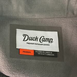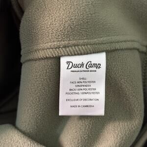 Details: Regular-fit sleeveless softshell vest with full front zip closure, stand-up collar, soft fleece-like interior for added warmth, and front zip pockets for secure storage; Duck Camp branding at neck; designed for hunting, hiking, and general outdoor wear.