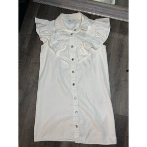 This is a ZARA white button-front dress, size XS, made in Morocco. It features a collared neckline and ruffled cap sleeves. The front has a full button placket with decorative silver-toned buttons and a ruffled yoke detail. The dress appears to be made of a denim-like or sturdy cotton fabric. No significant imperfections are visible, though some minor creasing is present from storage.