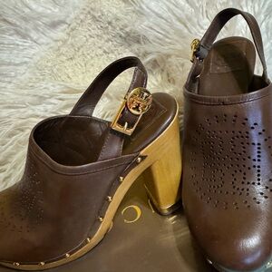 Tory Burch Dark Brown Leather Mules with Wooden Heel