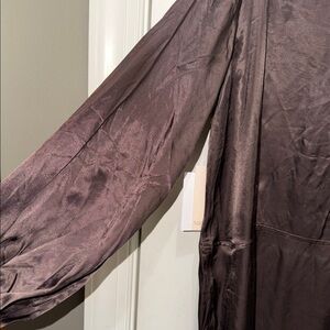 This is new tags size medium. Shoulder to hem 35 inches and under to under arm 20 inches. Rich chocolate brown color. Satin like material.