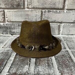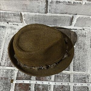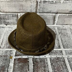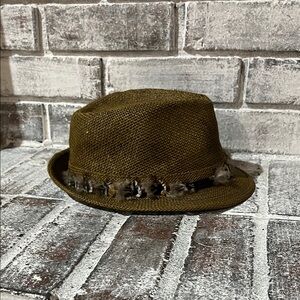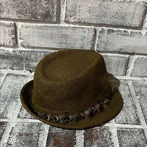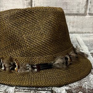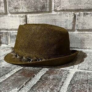 Stylish brown fedora hat featuring a decorative feather band. Perfect for adding a touch of elegance to any outfit. Please look at each picture carefully, ask any questions, make me an offer! BUNDLE AND SAVE!! ☺️